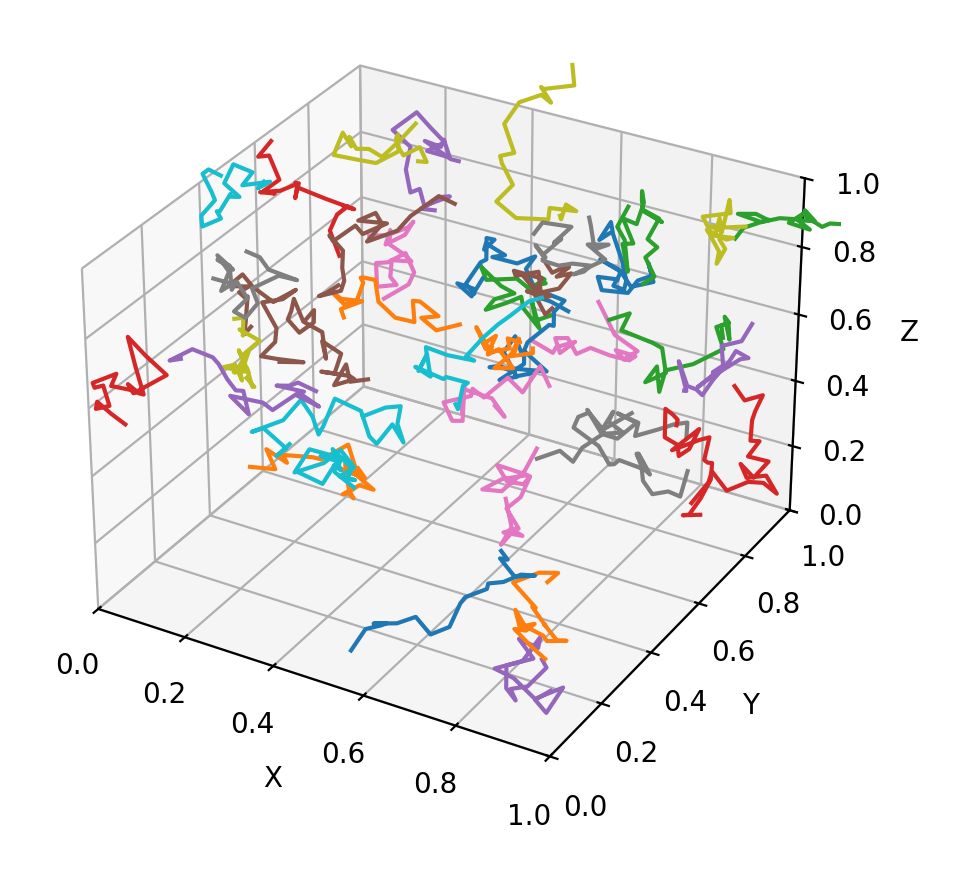 fig, update_lines, num_steps, fargs=(walks, lines), interval=100